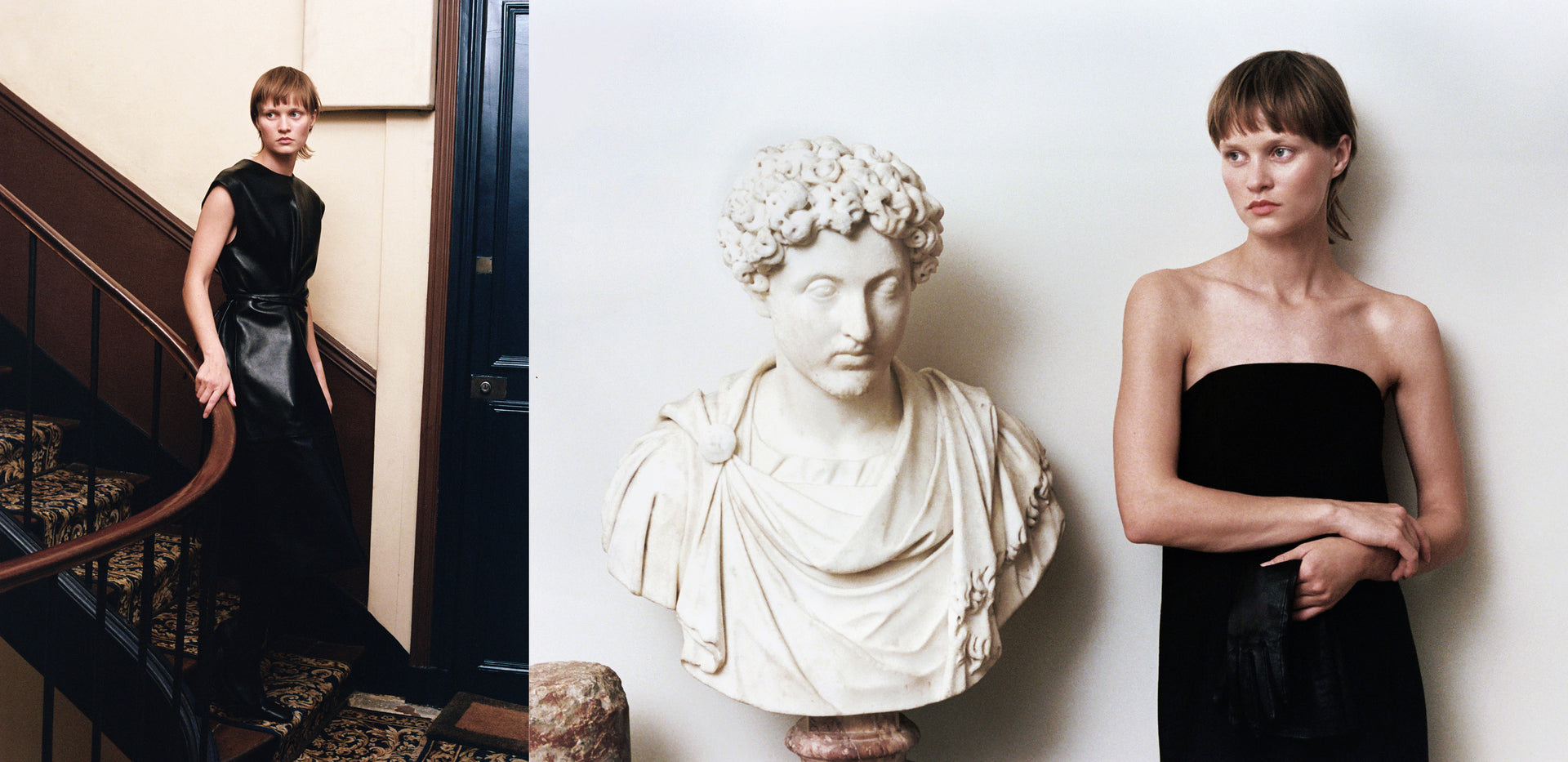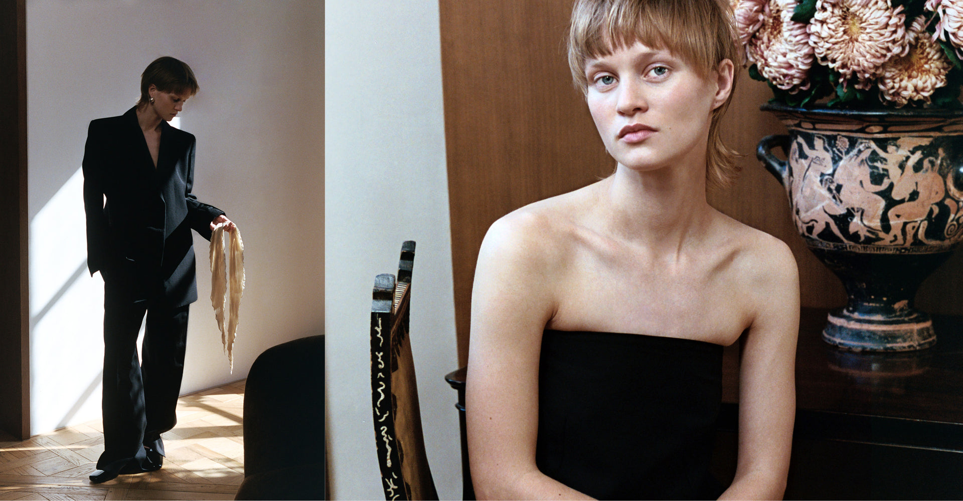 An oversized suit taken from the male wardrobe appears alongside a pared-down strapless wool dress. Shearling warms the body, while leathers glow in deep olive green or glossy black. Fine-gauge knits glide softly over the skin. Ivory Théa pumps, the Suzanna patent leather bag and a pleated silk scarf complete this sophisticated and understated look.