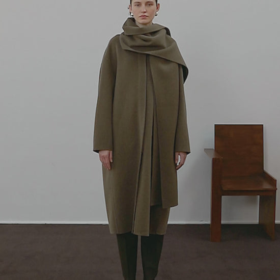 FINN is a long, ample mid-calf coat in double-faced heathered wool. Its round neckline and button placket add sophistication. Discreet pockets and a removable scarf provide comfort and warmth, perfect for winter. An elegant, versatile coat.